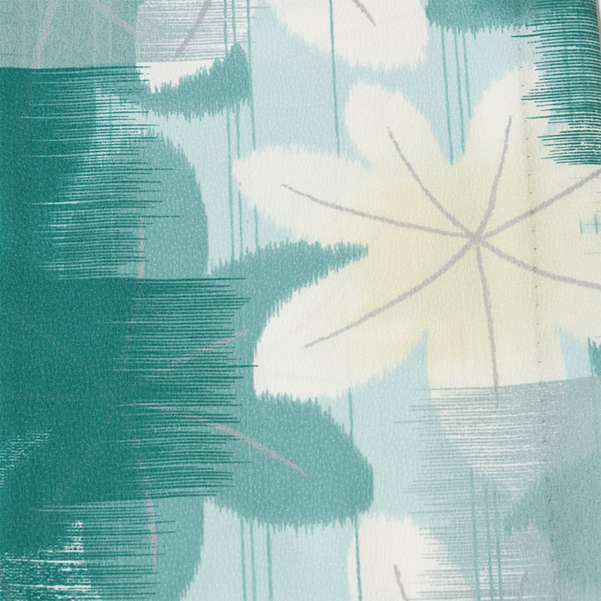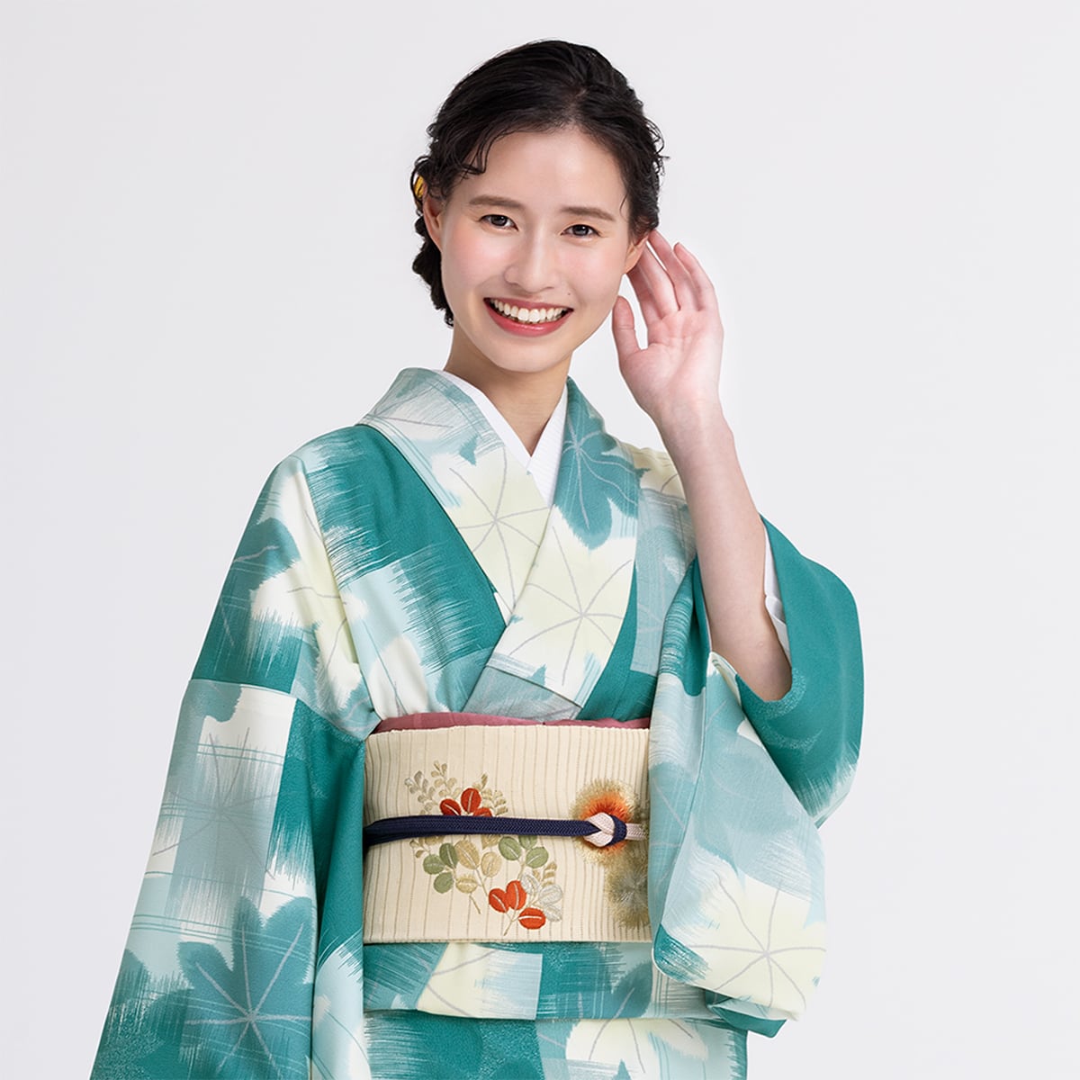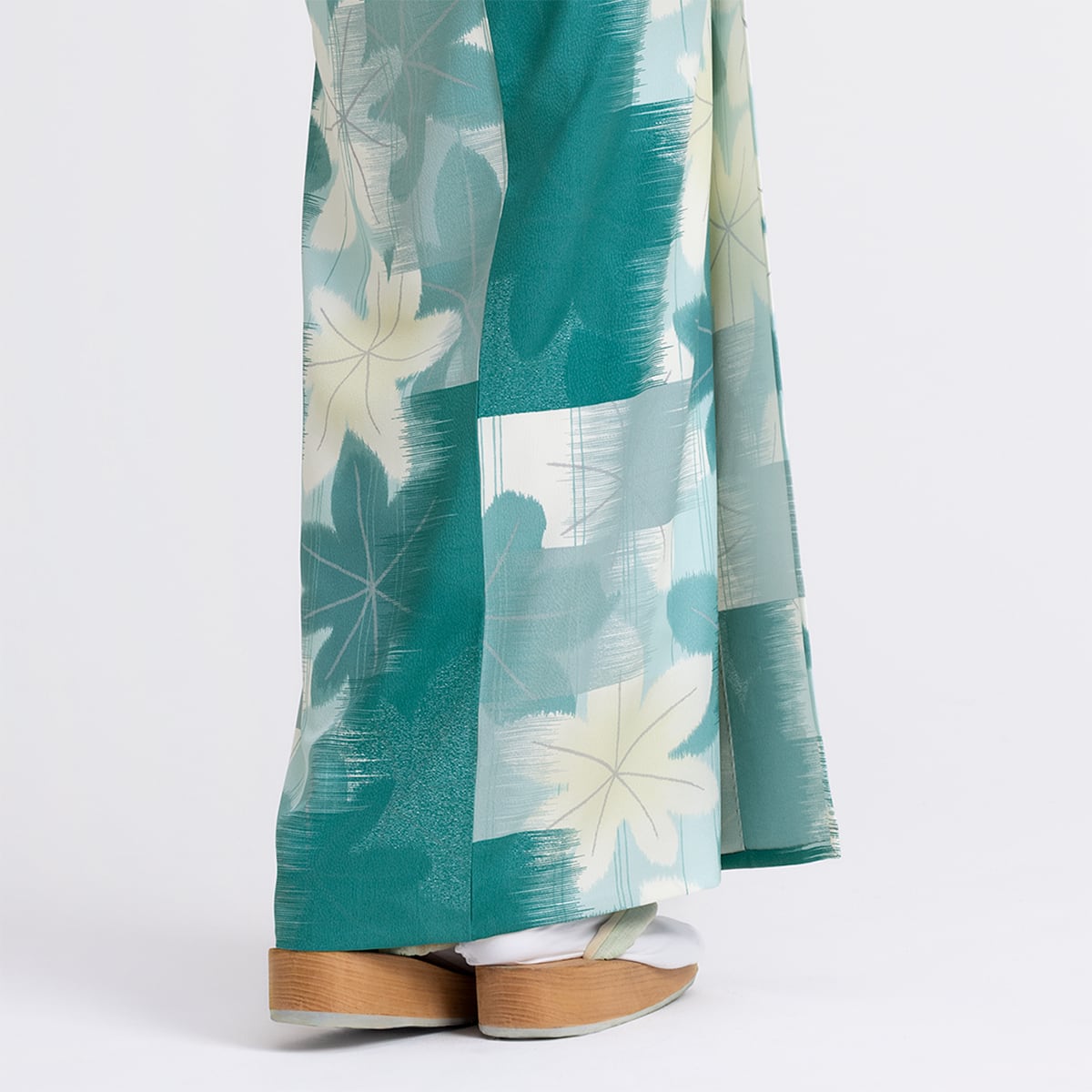 ⼭崎零先生コメント:「メープルレトロ」は、銘仙を思わせる大胆な柄と掠れた質感、どこか懐かしい、でも洗練されたレトロなイメージの一着です。瑞々しい「青もみじ」がモチーフで、新緑に包まれる京都の寺社仏閣や石畳の小道を歩く姿を想像をしながらデザインしました。